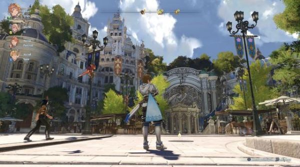 这款游戏在感官体验上充满了非常特殊的安定感,乍看之下你会讶异本作大胆地采用了足以称作奢华的细节作为基底,镶着金边的日系奇幻风格使游戏中的每个景场都带有一丝舞台般的戏剧性,于此同时,Cygames美术部门又以素雅的色彩降低了画面的突兀感,铺张却又不带压迫感、华丽却又十分耐看,而最能体现出这种成果的地方便是游戏中的花都场景,于此同时制作组还巧妙地设计出了借景视角来让玩家们感受一下GBF标志性的空域风貌,近且能细致、远且能壮阔,我想《Relink》大概是近年来最成功的日系奇幻风格的3D化成果了。