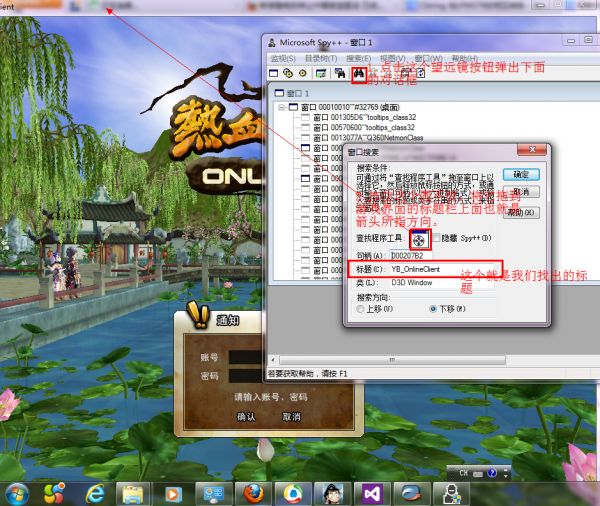 将那个圆拖到游戏标题栏后松开我们就可以看到这个游戏窗口的标题了。我们根据这个标题去找窗口句柄。