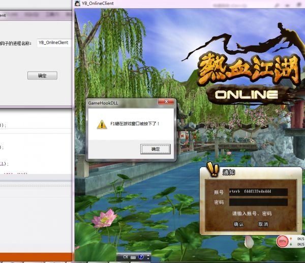 在MFC客户程序中输入我们用Spy++找出的游戏窗口名称,然后点击确定这样钩子就被注册到了游戏进程中。这时候我们在登陆框中随便输入,直到我们输入F1弹出对话框。这样通过键盘钩子注入进程的原型就搞定了。这一节就到这里。下一节我们利用这个钩子实现自动喝药的过程(比较慢,可能更新比较慢希望谅解)。