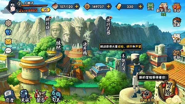 打开游戏,进入游戏的主界面。在主界面中我们看到最左侧的一列图标中(共四个图标),最上方的图标是一个齿轮形状的图标。这个图标就是《火影忍者》的设置,点击就可以进入到《火影忍者》的设置窗口。