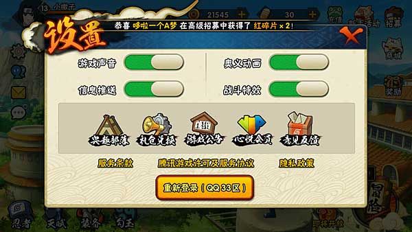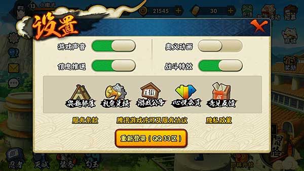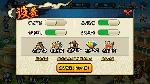 在设置窗口中,我们看到有四个开关按钮,分别是“游戏声音”、“信息推送”、“奥义动画”、“战斗特效”。我们对这些选项进行一一讲解,玩家可以根据自己的需要选择是否要应用这些选项。