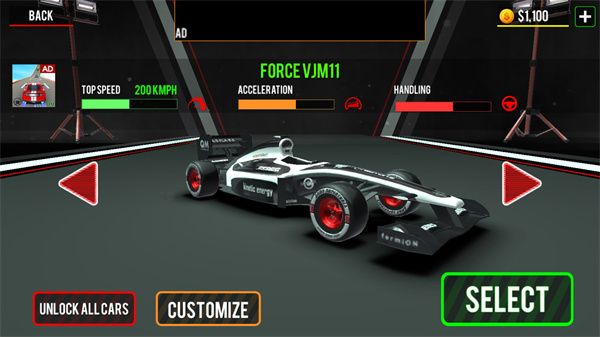 2、选择你的赛车,每一辆赛车的性能都各不相同;