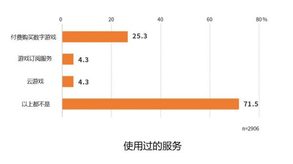 在这三种服务形态中,“付费购买游戏”的用户占25.3%,约占整体的四分之一,而回答拥有“游戏订阅服务”“云游戏服务”使用经验的用户占比很低,只有4.3%。与购买并下载付费游戏的用户相比,“服务”的使用率仍然很低。