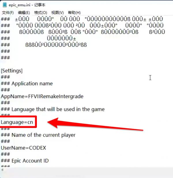 8、用记事本打开该文件后找到Language=en 这是默认的,改成Language=cn 即可。这样我们的游戏就变成了中文。