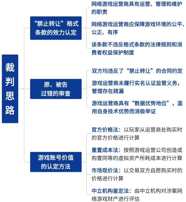 为便于管理,游戏运营商往往设立“禁止游戏账号转让”格式条款,本案中人民法院肯定该条款的效力,并认定双方均违背了合同条款,同时游戏运营商未将实名认证措施贯彻落实,在管理上确存在纰漏,故游戏运营商及游戏玩家应各自承担相应责任。此外,本案明晰了“充值金额”“交易价值”“市场价值”等不同概念的含义,探索了游戏账号价值的认定规则。