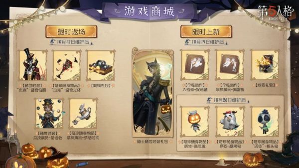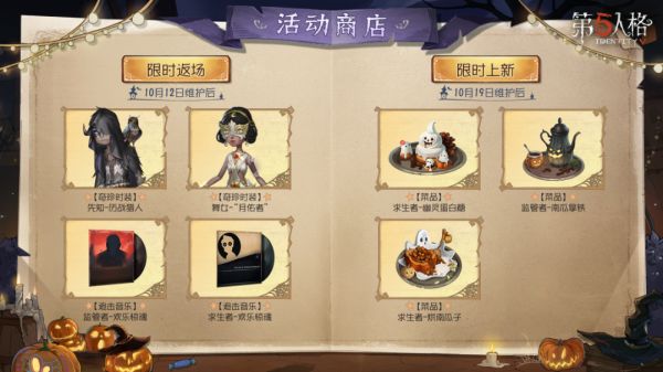 —— 【奇珍时装】先知-历战猎人、【奇珍时装】舞女-“月佑者”、【独特时装】黄衣之主-神谕大司祭、【追击音乐】监管者-欢乐惊魂、【追击音乐】求生者-欢乐惊魂限时返场活动商店;