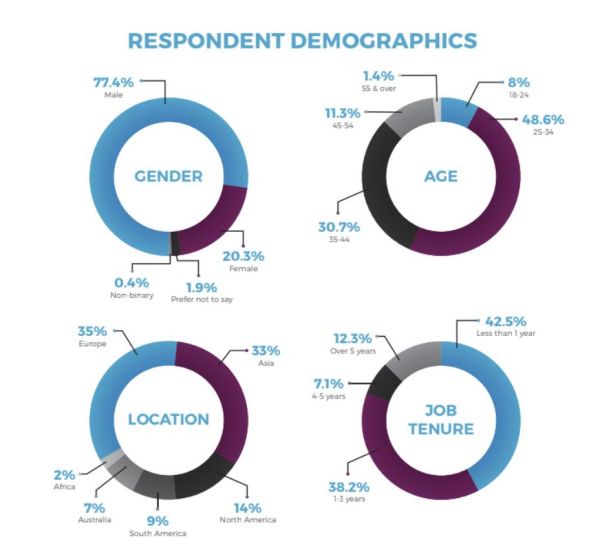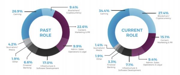 这是一个非常年轻的行业。在所有受调查者当中,34%的人都是游戏专业人士,27%为区块链专业人士,81%的人在当前职位就业时间都在3年以下,42.5%的人从业不足一年。