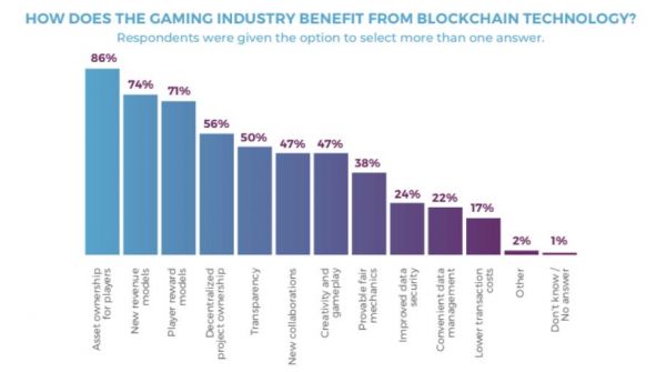 报告表示,85%的受访者认为资产归属权是去看了游戏最重要的优势,因为该技术带来了数字资产权力并让玩家对自己的游戏内资产拥有真正的所有权。这与传统中心化游戏平台的规则相反,因为后者禁止在游戏外市场售卖游戏内资源。一个比较明显的案例就是中国市场的腾讯曾经起诉DD373.com,表示该网站的游戏内资产交易给《DNF》带来了620万美元的损失。