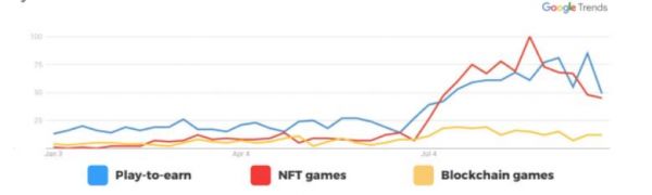 在2021年期间,人们对区块链游戏的兴趣在稳步增长,下图展示了Google Trends的全球走索兴趣变化。区块链游戏、NFT游戏和Play-to-earn等关键词的搜索量在2021年7月份首周出现了大幅增长。