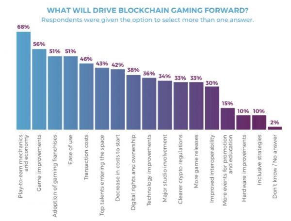 尽管有诸多的挑战,但受访者们表示对行业的继续发展非常有信心:68%的受访者称Play-to-earn机制和经济将会是带动行业发展的主要动力。