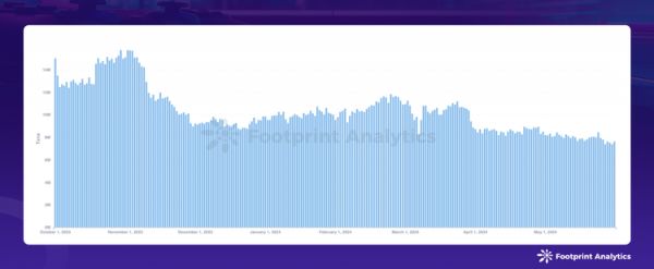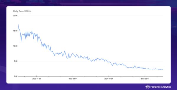 在观察了 5 月份的市场动态后,我们注意到一个颇为有趣的现象:区块链游戏中每日交易量的下降趋势与每日活跃用户的上升趋势并存。自 2023 年 10 月以来,每日交易量与每日活跃用户的比率已从 17.2 逐步降至 2.3。