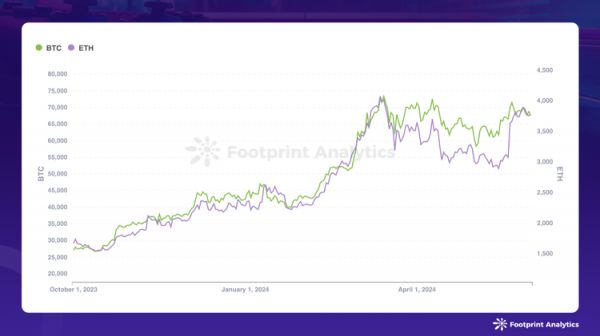 2024 年 5 月,比特币自 4 月底的低点强势反弹,从月初的 60,653 美元攀升至月底的 67,606 美元,涨幅达到 11.5%。与此同时,以太坊也展现出强劲的复苏态势,其价格在同期内从 3,011 美元上涨至 3,778 美元,涨幅高达 25.5%。