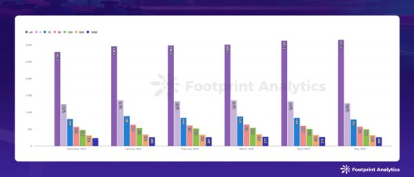5 月份,区块链游戏的总数量攀升至 3,153 个,其中 1,272 个处于活跃状态。在这些活跃的游戏中,有 263 个游戏成功吸引了超过 1,000 名的月度用户,这一数字占总游戏数量的 8.3%,同时也占据活跃游戏数量的 20.7%。