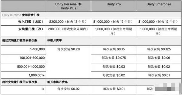 此前,Unity宣布在游戏达到特定安装量和收入门槛后,将会每次安装收取运行时费用,此举引起了大部分开发者们的强烈不满,具体来说就是玩家每安装一次,开发者就要给一次钱,像个人版的开发者,每次安装费在0.2美元的样子,专业版和企业版用户安装费分别为0.15美元、0.125美元,当安装次数达到一定量,还有相应折扣。