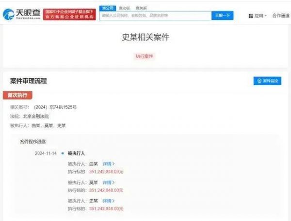 11月18日,据天眼查消息,史玉柱、莫立军、曲敬慧新增一条被执行人信息,涉及金额3.5亿元,由北京金融法院负责执行。此外,巨人投资有限公司、上海巨人投资管理有限公司也新增2条被执行人信息,执行标的合计8.7亿余元,执行法院为北京金融法院。