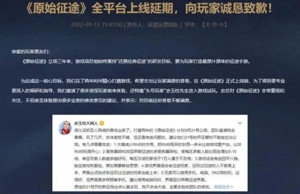 2022年9月, 巨人网络旗下新手游《原始征途》宣布,原定于9月21日的公测延期,原因是史玉柱发了一条微博,表明其已重返研发一线,并对《原始征途》提出了多条修改意见。