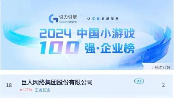 在2024年9月引力引擎发布的《2024年中国小游戏百强企业榜》中,巨人网络凭借《王者征途》入围并排名18。