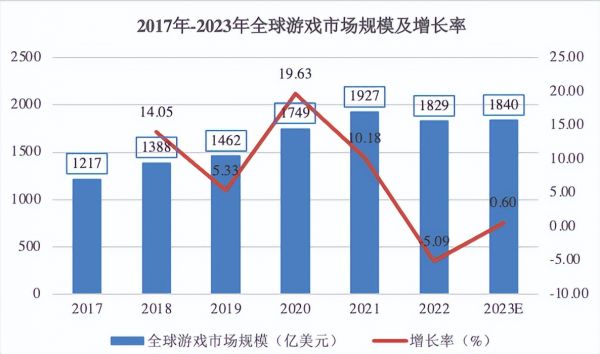 电子游戏行业起始于 20 世纪 60 年代末,经过数十年的发展和演变逐步进入市场成熟期,成为一个全球规模过千亿美元的庞大产业。近年来,全球电子游戏市场稳步发展,2017 年至 2023年全球电子游戏市场规模及增速如下: