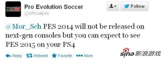“《实况足球2014》不会推出次世代主机版,但你可以期待《实况足球2015》在PS4平台的亮相。”