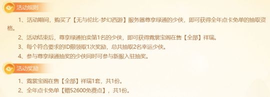 而且,凡是购买【无与伦比-梦幻西游】尊享绿通的小伙伴,都可以参与全年点卡免单活动,抽中就是【52600免费点】。所以,根据猪队长往年的经验,【无与伦比-梦幻西游】大区的热度势必火爆,尊享绿通的入门门槛可能会超过4万仙玉,5万仙玉或许是一个比较稳的数值。