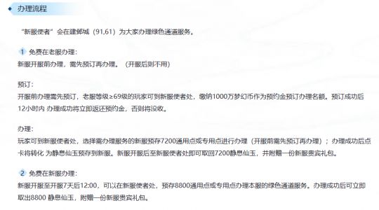 办理方式很简单,一是去找新服使者直接办理,预存8800通用点或专用点后即可办理,办理后点卡将转化为静息仙玉预存到新服,并获得一份贵宾礼包。