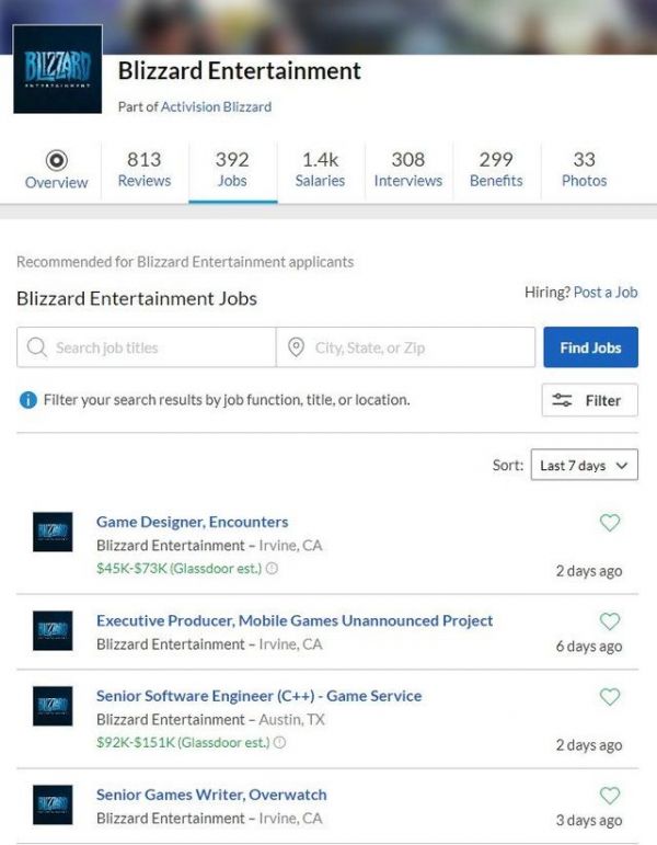 暴雪在近期发布了新招聘职位,包括负责《守望先锋》的高级游戏编剧、负责游戏服务的高级软件工程师(C++)、负责一款未公布手游项目的执行制作人、以及负责遭遇战设计的设计师。