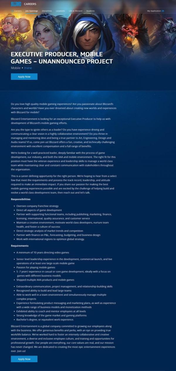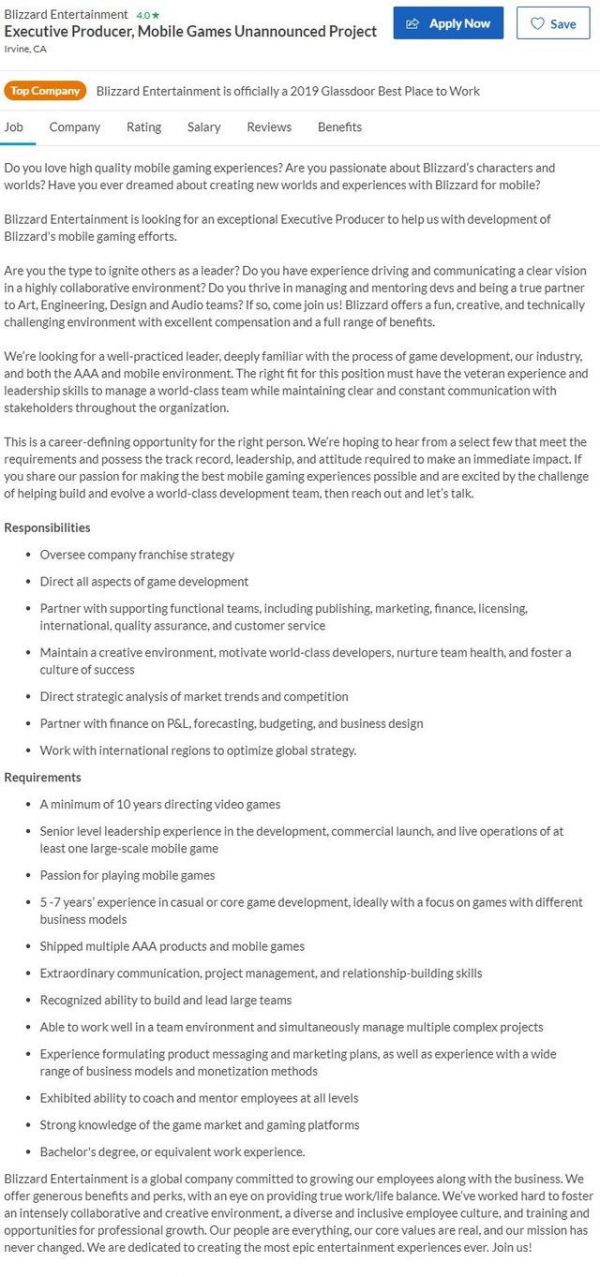 近日,暴雪官网的招聘信息显示,他们正在为为一款“未公布的手机游戏”招聘执行制作人,要求必须参与过领导和制作3A和手机游戏,有10年以上制作游戏的经验,在休闲或核心游戏开发方面拥有5-7年的经验,而且至少制作过一款大型手机游戏。但是招聘信息中没有透露任何关于这款不知名手游新作的消息。