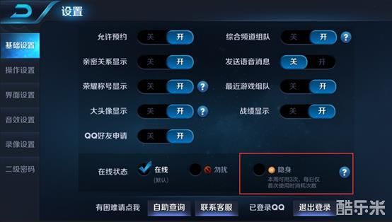 召唤师们可以在“设置=》基础设置=》在线状态”中进行隐身状态的设置。