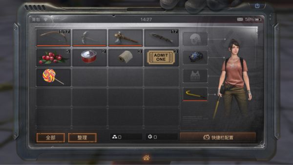 我们首先打开背包,可以看到一个界面,在左边会显示你目前已有的装备以及医疗食用品。右边显示的是你的目前装备情况,我们点击下方的快捷栏配置会跳转到快捷栏配置的界面。