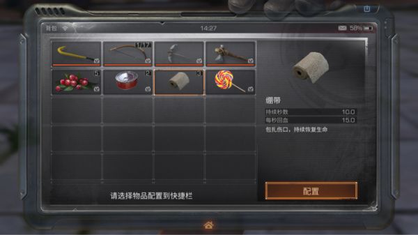 首先我们选择在左边的物品栏目内选择绷带,可以看到会出现一个界面,显示绷带的持续秒数以及回血。下面还有个配置的按钮