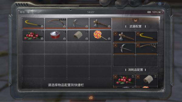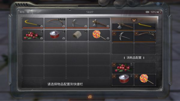 进入快捷栏配置后我们可以看到在下方的消耗品配置内是没有绷带的。那么我们就可以把绷带添加到快捷栏。