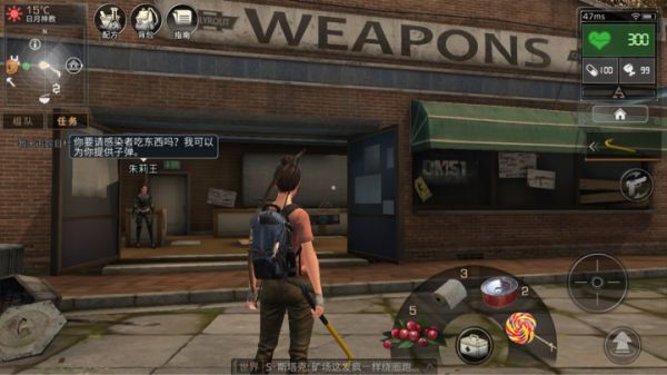 我们看到在屏幕的右边可以快捷选择武器,在右下方有个医药箱能快速使用绷带或者食用罐头野果等食物。