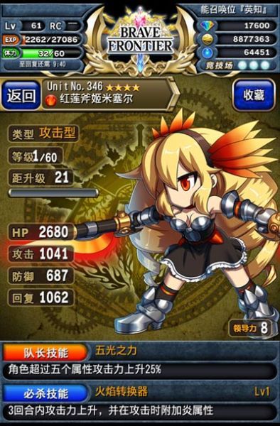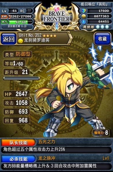 【队长】雷属性英雄“龙刹骑罗迪英”看似平凡,却是4星英雄中攻击力仅次于“红莲斧姬米塞尔”的攻击好手,还能为团队提供多种群体“服务”。队长技能:角色超过五个属性,攻击力上升25%,主动技能:友方BB能量槽略为上升&3回合攻击中附加雷属性,成为笔者嘲脸型队伍的队长首选人物。