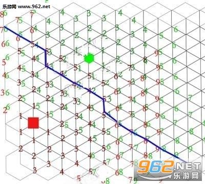 红色方块代表猫的起始点,绿色六边形代表你的开局第一子。红色数字代表猫需要那么多步才能跑过去,绿色数字代表你的子需要那么多步才能连过去。