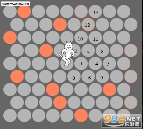 刚开始玩的时候觉得很难赢,静下心来仔细想想,算法肯定是按照离边界的最短距离路线来移动小猫,这么一来甚至可以给小猫挖坑