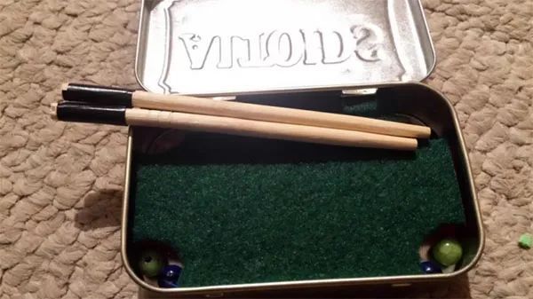 台球算不上桌游,然而袖珍版是你奔波中找乐子的不错选择,非常有趣。除了3D打印零件外,这个项目还需要额外配件,包括筷子做的台球杆、毛毡做的迷你台球桌,当然还需要糖果铁盒来摆放这一切。设计师建议使用小珠子做台球,实际上也能买到小粒弹珠,看起来挺适合。