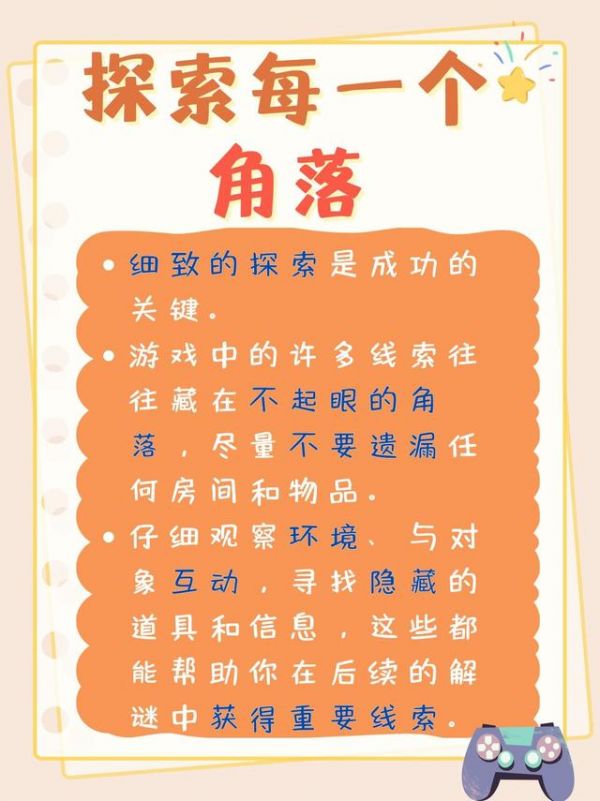 在游戏中,细致的探索至关重要。 尽量不要漏掉每一个房间和物品,许多线索往往藏在不起眼的地方。通过细致的观察,你会发现一些隐藏的道具和信息,帮助你解开后续的谜题。