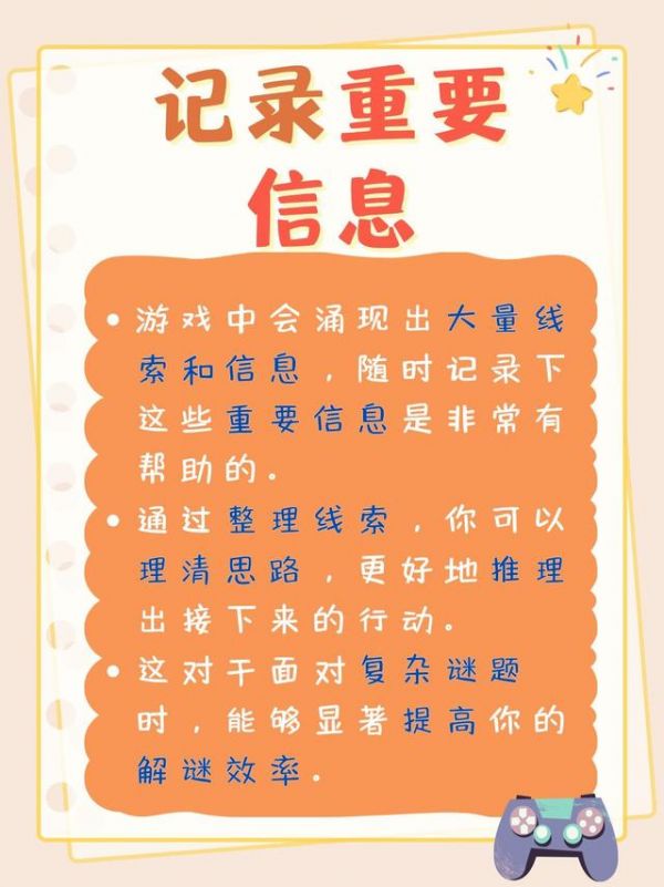 ✨记录重要信息将帮助你理清思路。 游戏中有大量的信息和线索,通过记录和整理,你可以更有效地推理出后续的解决方案。在面对复杂的谜题时,整理信息会让你的思路更加清晰,从而提高解谜的效率。