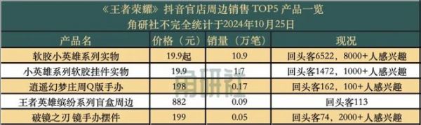 目前,《王者荣耀》官方推出的软胶小英雄系列周边,是近期位居店铺销量TOP1的产品,受到了抖音平台大量玩家的一致好评,销量突破10万。不少玩家都对其周边十分感兴趣,纷纷下单回购。