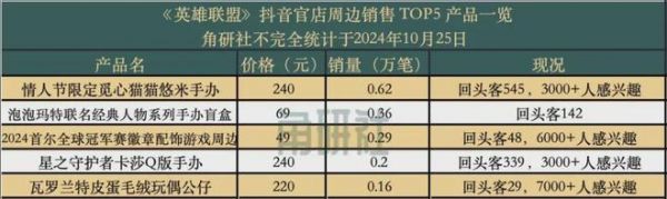 以上是《英雄联盟》抖音官店周边销售TOP5产品,其中最受欢迎的是“情人节限定觅心猫猫悠米手办”。从数据可以看出,其推出的各款衍生周边在抖音平台的销量也是很不错的。