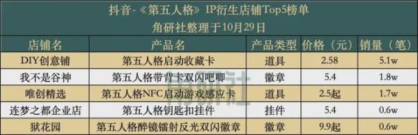 《第五人格》衍生品TOP5中,卖得最好的产品是启动卡道具以及徽章两种类型。尤其是启动卡,不仅品类受欢迎,价格上也占据很大的优势。位居TOP1的这款启动卡,销量5w+,远超其他产品。