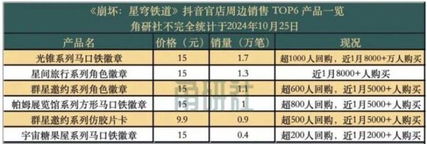 “崩铁”官方周边旗舰店受到了15.7万玩家的支持,店铺销量达15.4万。以上6款产品是目前店内销量靠前的,且每款产品在近一个月内都有上千人购买。
