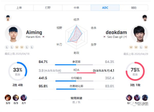Aiming最近的英雄选择主要是女枪、EZ、寒冰这几个英雄,他的参团率高达84.7%,可见队伍很多时候还是喜欢帮助下路打开局面的,他的场均KDA是3.9,可见他的团战输出能力和收割能力还是不错的,分均输出也是达到了441,在这个喜欢运营的LCK也是不错的数据了,他的打线和团战都不错,面对大多数AD都不会吃亏。