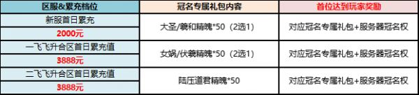 (1)2024年12月5日之后的新区开服首日达到额度,即可获取【冠名专属礼包】奖励,首位玩家可以获得服务器冠名权。