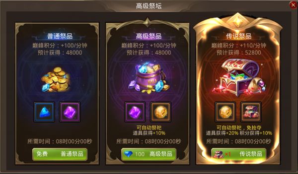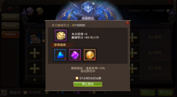 祭坛祭祀可以获得巅峰积分,以及养成巅峰段位的道具,祭坛分为低中高三档,不同档位获得积分以及道具的效率不同,每档祭坛又分为普通、高级、传说祭祀