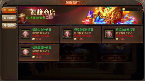 巅峰商店分为 每日,每周,每月限购,需要角色穿戴达到条件阶数的装备后才能使用巅峰积分购买