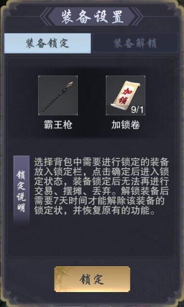 当玩家准备好加锁卷和想要锁定的装备后,就可以进入锁定界面了。