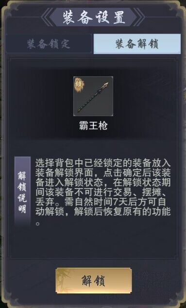 锁定的装备进入解锁保护期,时间为7天。在这7天里中,可以随时检查解锁进度,但不能进行交易、丢弃、分解等操作。这是为了