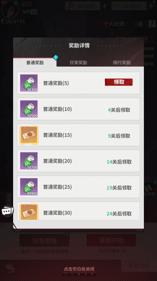 2、首通奖励:每战胜5波敌人可获一份首通奖励,需要手动领取,首通奖励只可领取1次;