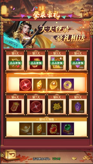活动期间主公每天登录即可领取不同奖励,赋魂神石、招贤令、高级招募令等奖励免费领取。